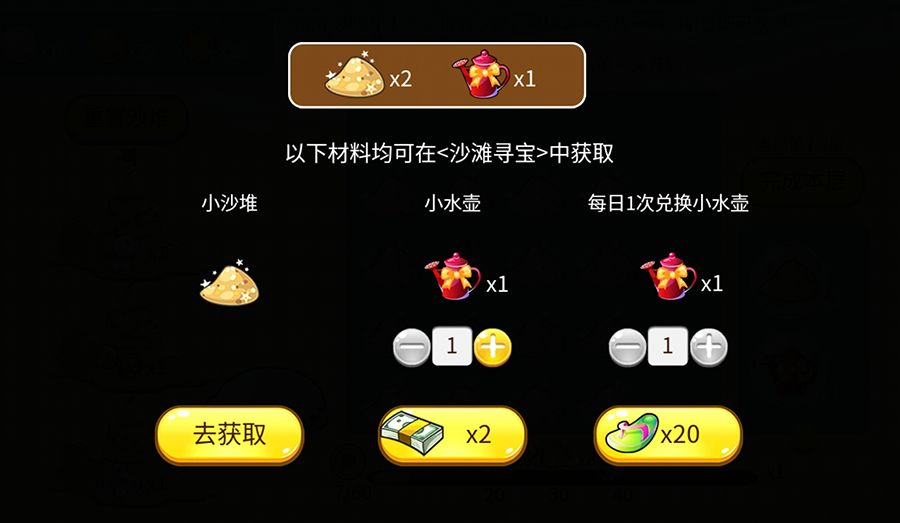 收集足够多的沙堆、水壶后,来堆堆沙堡喽~