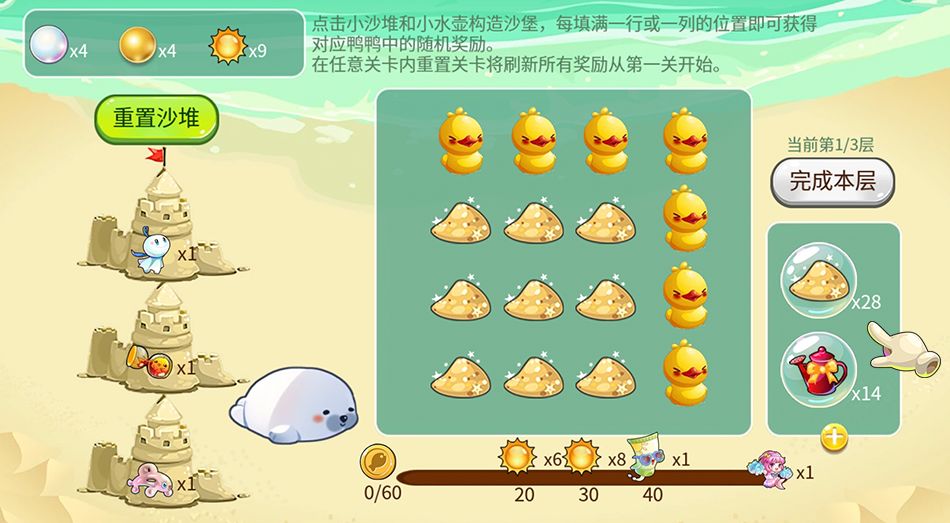 点击右侧的沙堆、水壶构造沙堡,填满获得鸭鸭位置的奖励。完成每层后还可以获得左侧的鱼儿奖励~