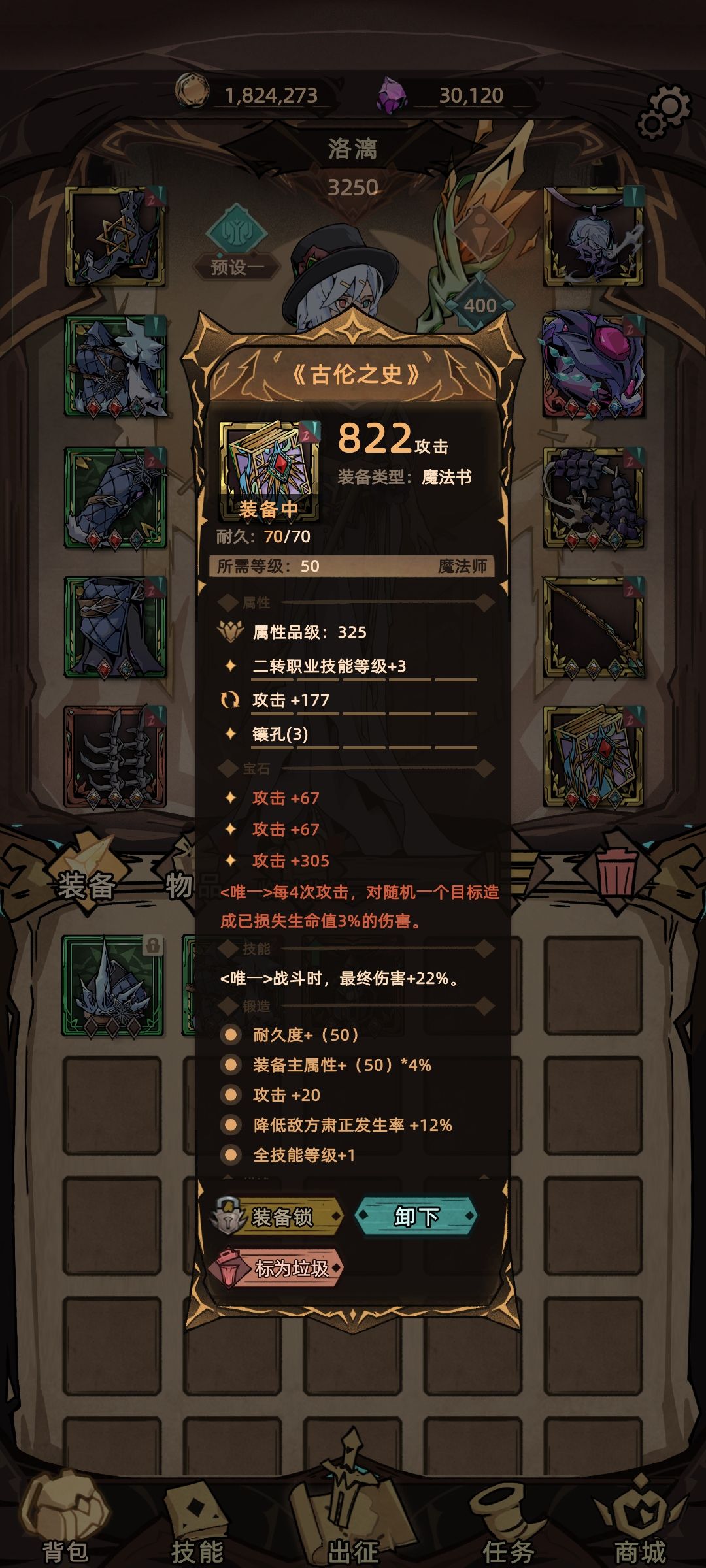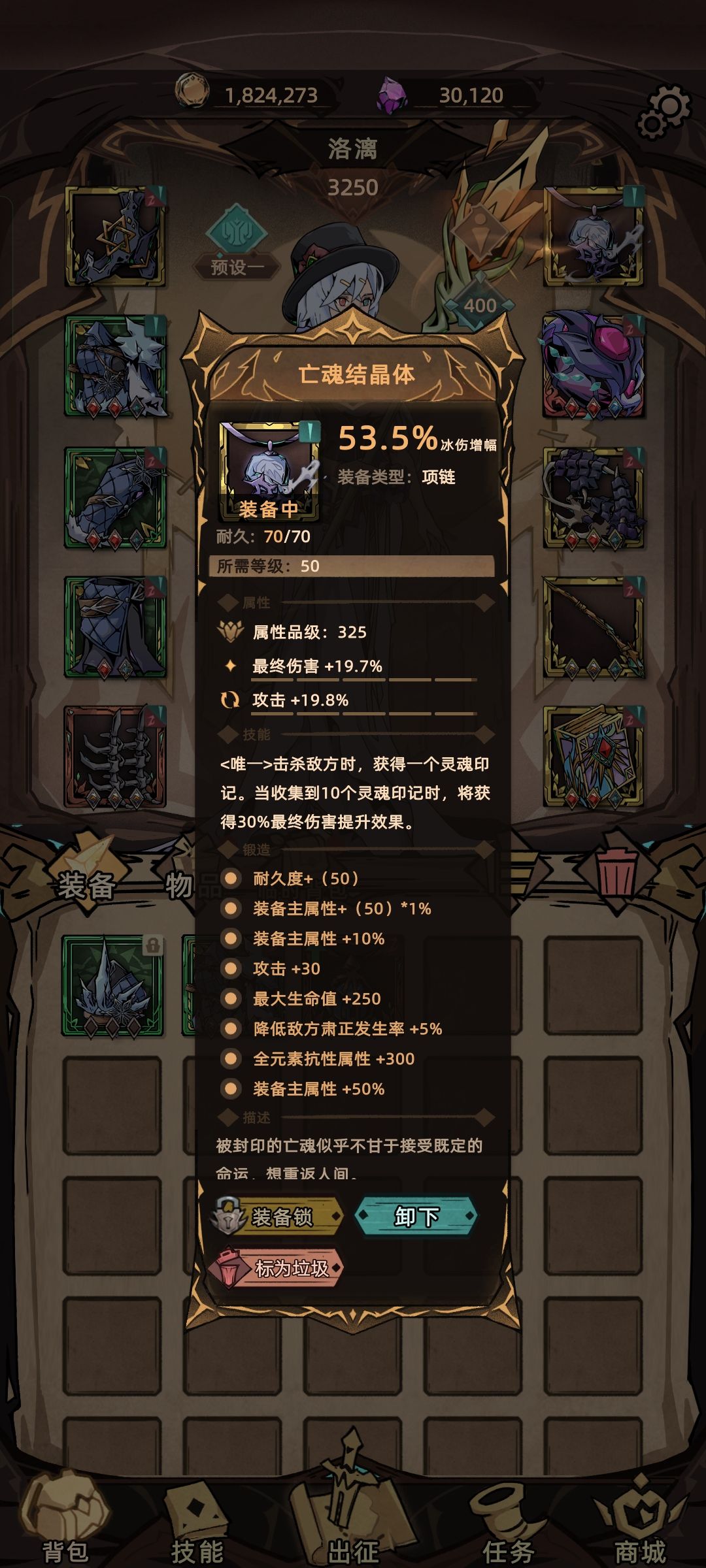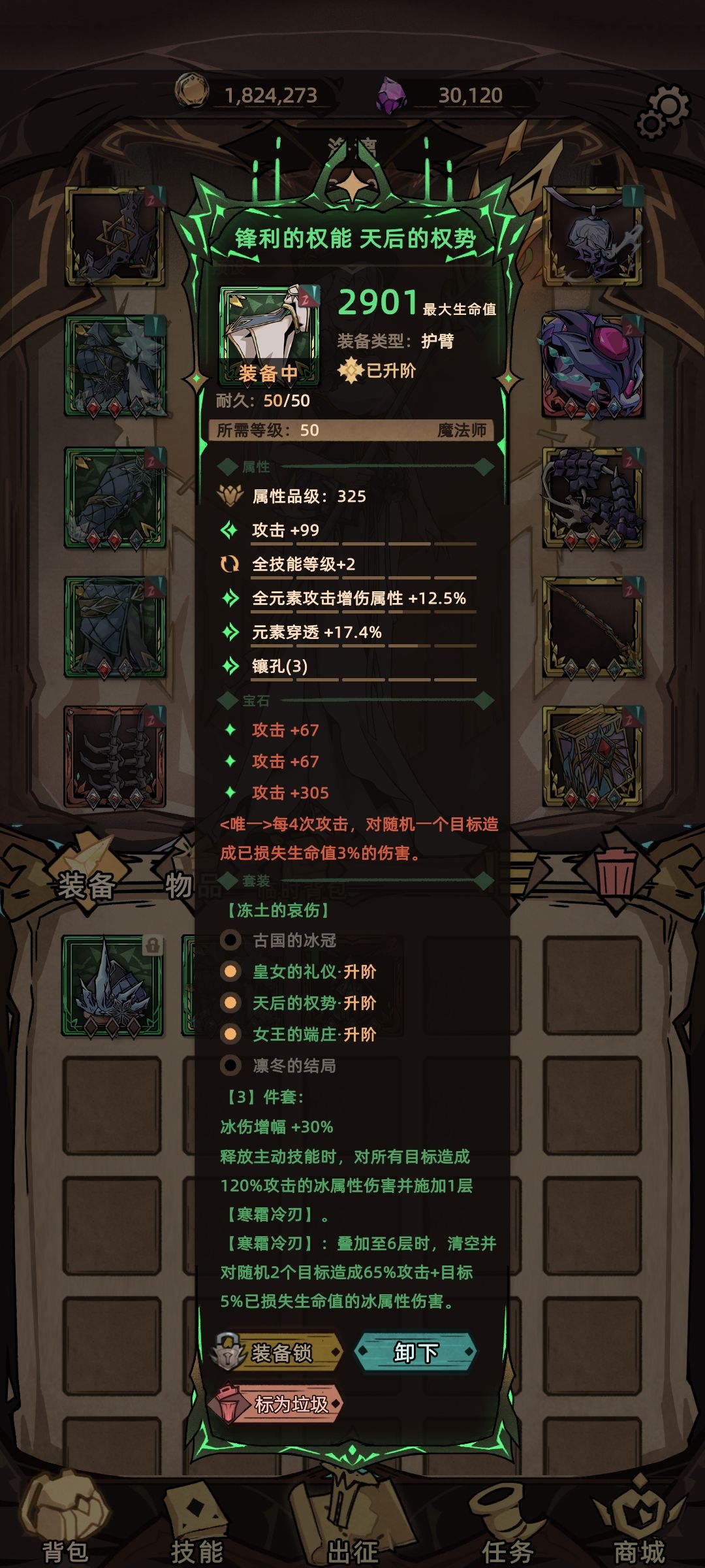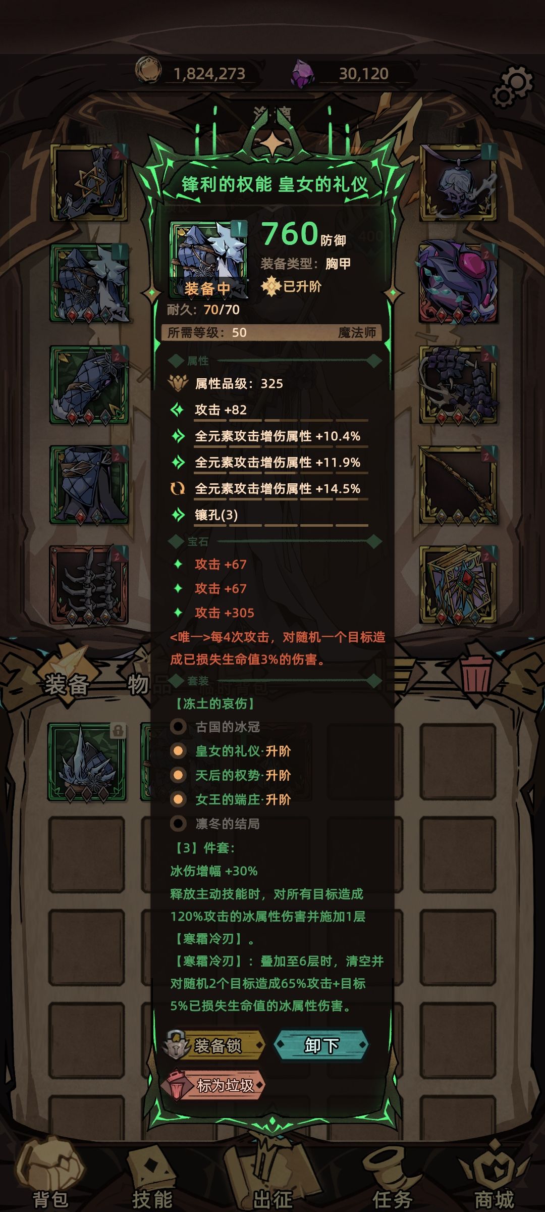 衣服:进阶冰套衣服,极限毕业词条为三元素增幅,攻击,三孔。