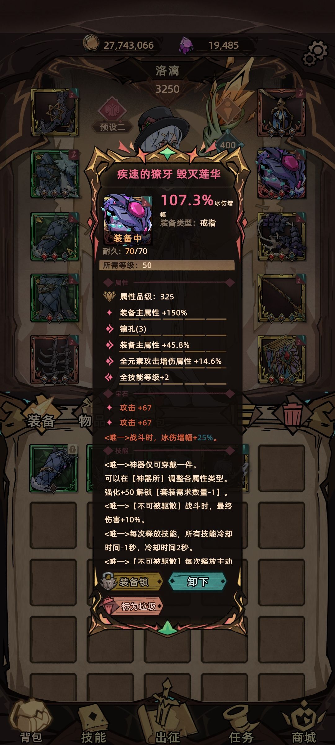 另一个戒指换神器毁灭莲华,毕业词条为+2全技能,全元素增幅,主属性强化,三孔。神器所制作。