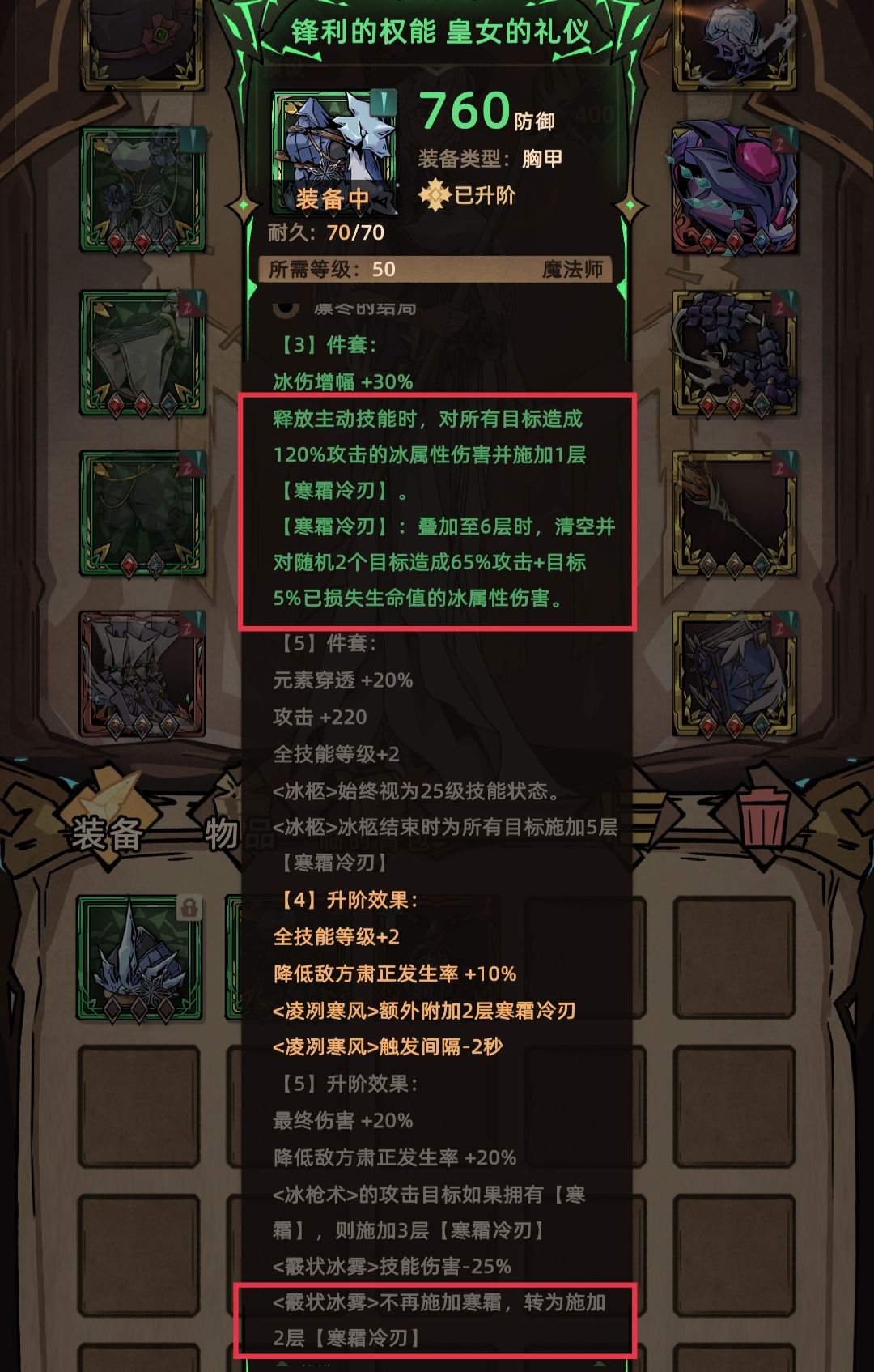 有人可能会问,为什么舍弃了魔女手的高终伤?因为如果不换魔女手只换衣服裤子凑三件套的话,会缺一条10%降肃正(强迫症,不到120难受),这一条需要从神器戒指洗炼或者防具打造随机出,神器戒指洗降肃正很亏,防具出降肃正又很难就是了。所以四件套舍弃魔女手32终伤换取三秒之后常驻(第三波怪)的75%冰伤增幅,省下一条10%降肃正是值得的,何况换掉魔女手的情况下,还多了三条输出词条以及三个孔。