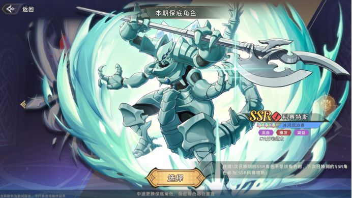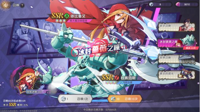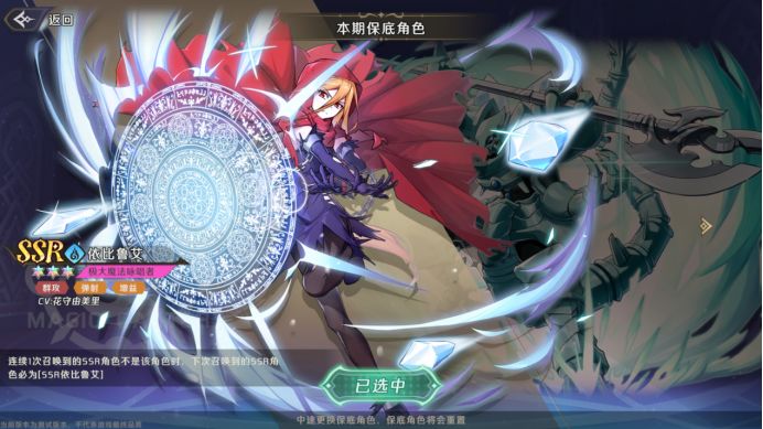 游戏中第一个UP卡池为【冰封蔷薇之瞳】,一共拥有2个SSR角色可选,分别为依比鲁艾和科塞特斯,至尊们可以任选其一作为保底。在up卡池中,如果第一个抽到的SSR角色不是保底角色,则下次召唤出SSR时必为保底角色。