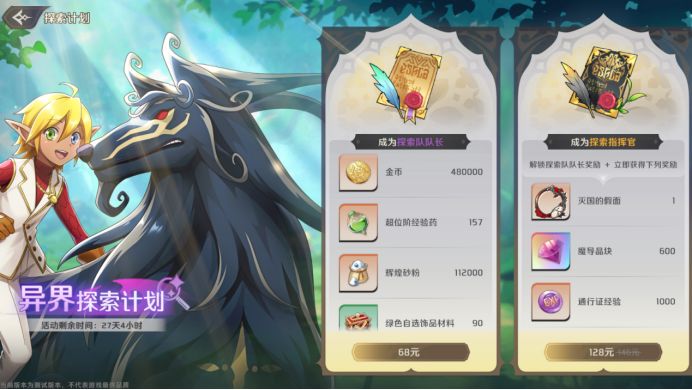 中氪玩家除了首冲、月卡等,最值得投资的就是就是异界探索计划(即通行证),通行证有68和128两种价位,68的通行证性价比较高,可以比普通通行证多获得大量的金币、经验药、各种养成材料、高级通用技能点(这个很重要)和魔导晶块;128的还可以额外获得魔导晶块以及大量的通行证经验,快速获取通行证的等级奖励。