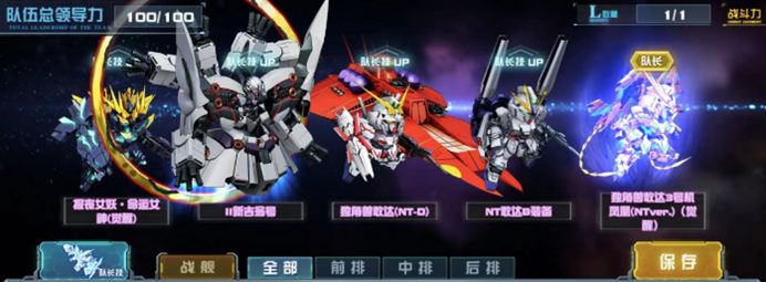 以独角兽敢达3号机凤凰(NTver.)(觉醒)为队长的双典藏多模式机体队伍,与上一套阵容类似,需指挥官根据实际情况进行队伍间机体调换取舍。