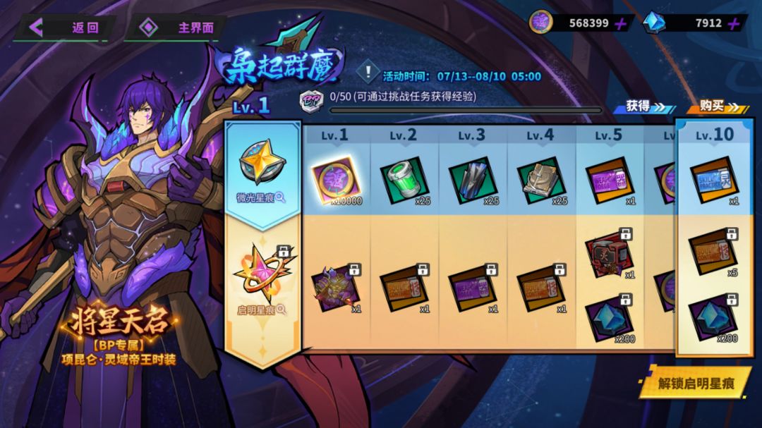 活动期间可免费解锁【微光星痕】,开启【启明星痕】后可解锁额外奖励线并立即获得「项昆仑·灵域帝王」专属时装「将星天启」!