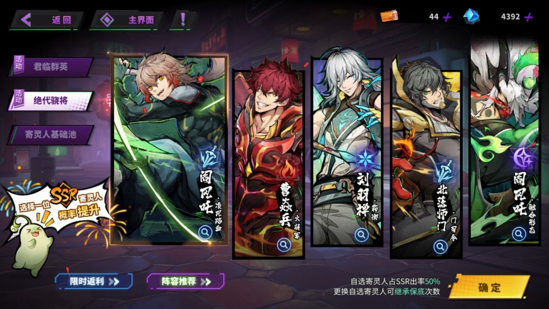 限时活动期间,镇魂将可选择「曹焱兵·火将军」「北落师门·门司令]「刘羽禅·霜御」「阎风吒·凌风踏血」「阎风吒·融合形态」中的一位寄灵人提升配送获取概率。自选寄灵人占SSR出率50%,更换自选寄灵人可继承保底次数。
