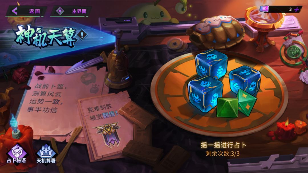 活动期间,镇魂将每日可参与3次「神机天算」活动,挑战成功可获得「旗开得胜」「森中犒赏」「羽林犒赏」「罗刹犒赏」,用于在“群星阁-天机算署”内兑换奖励。掷骰次次大成功,奖励到手多多多!