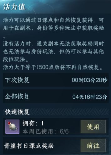 活力值:每4分钟正常回复一点,每天恢复360点