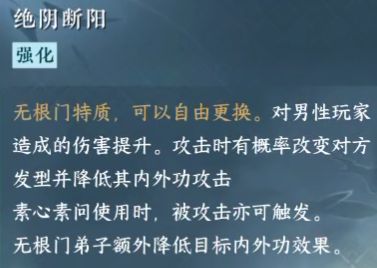 门派介绍:苍天不覆,厚土不载,来无来处,漂泊随风,是为无根。 传说,其与江湖之外的势力似乎有着千丝万缕的勾连,而入门的条件也极为苛刻。