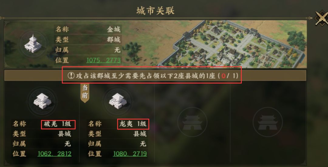 3.2城池类型:首先游戏内可被攻打的城池建筑有三种:县城、郡城和关隘。郡城的攻打条件会多一个,就是要求需占领一定数量的下属县城(郡跟其下属县有白色连线)。城市等级越高,城池守军会越来越强,联盟和个人收益会越多。占领关隘则可进入下一级资源州,5级以上郡城会解锁城池采购功能,6级郡城会解锁特殊兵种。