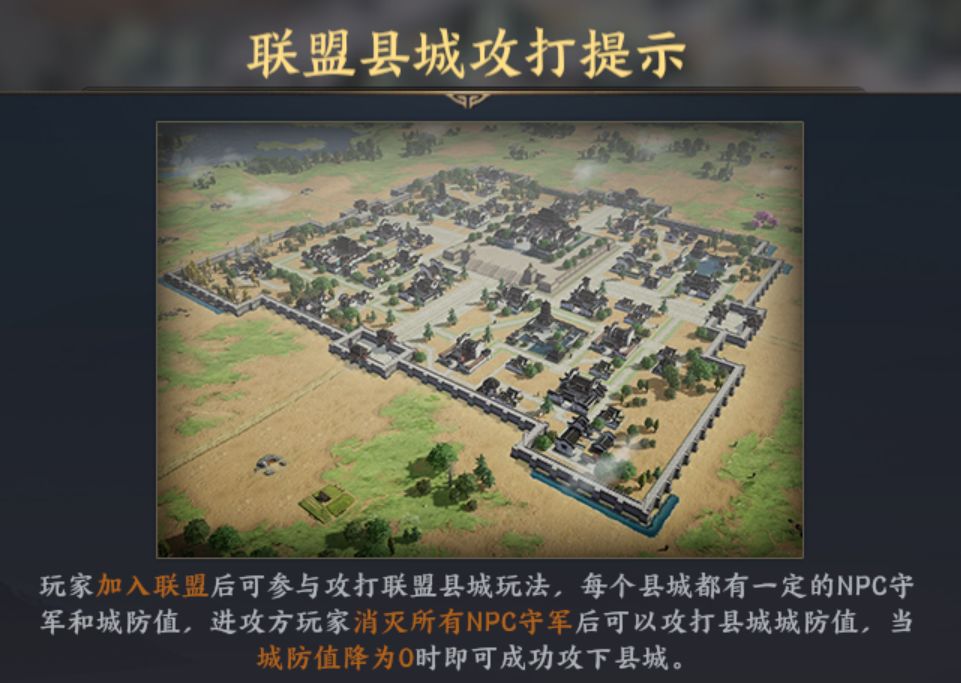 宣战:满足攻城条件后,联盟官员(盟主,副盟主,军师,将军)可成功对城池宣战,宣战倒计时完成后,就可以正式攻城了。占领条件:每个城都有一定的NPC守军和城防值,进攻方玩家消灭所有守军后可以攻打城防值,当城防值降为0时即可成功攻下城池。如果也有其他联盟同时宣战攻打,那么将以城池的城防值最后一击的玩家所在联盟作为成功占领联盟。有时候城池太硬或联盟太弱,可能需要其他联盟帮忙消耗守军跟城防,那么协助的联盟在城防快没的时候即时撤离。