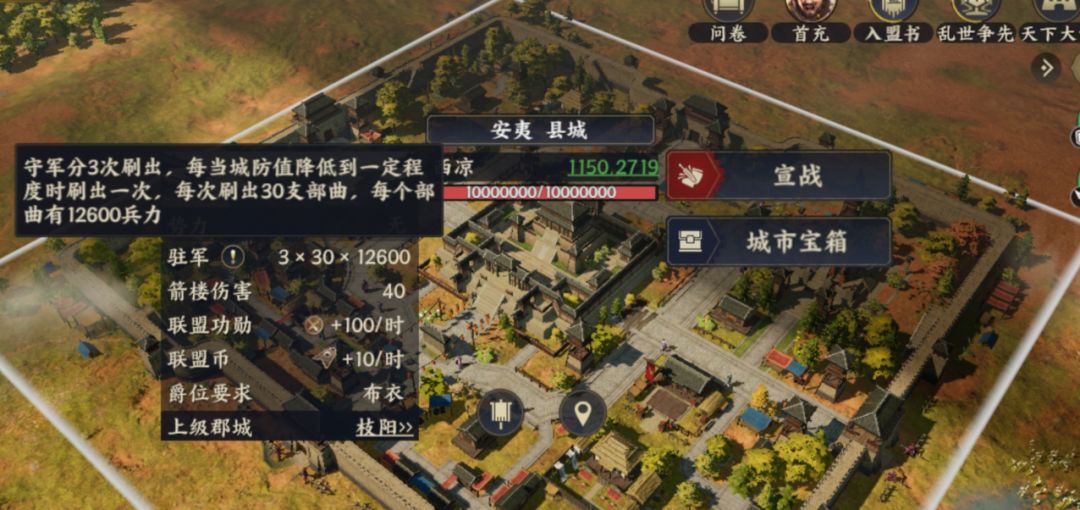 三 正式打城3.1攻城时间:游戏内攻城(郡城和关隘)时间固定为每天的21:00~22:00,固定时间避免了联盟之间太卷,护肝。需注意县城只要满足攻打条件,可任意时间进行宣战攻打(不建议夜间时间攻打,玩家攻城值会有所虚弱,打城效率低)