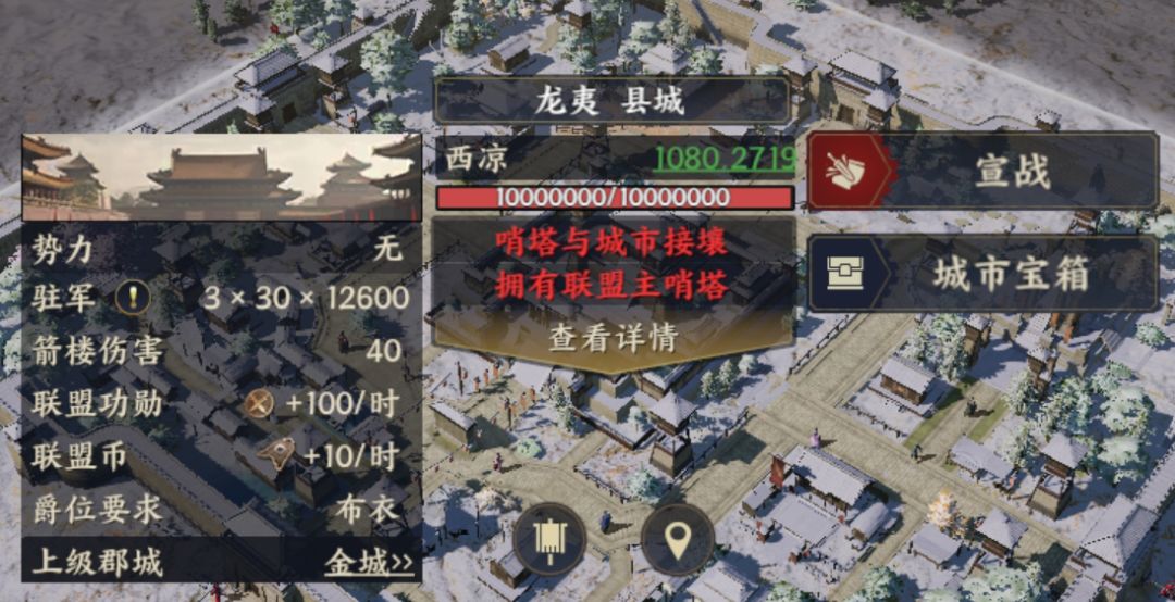 2、提前铺路,这里联盟官员要重点关注的内容,包括规划好打城路线,通过建立哨塔,召集盟员加速哨塔建筑进行铺路。因为在《战地无疆》中,打城是需要连地的。比如这个1级县城,需要联盟哨塔与城市接壤,且拥有主哨塔才可以宣战。