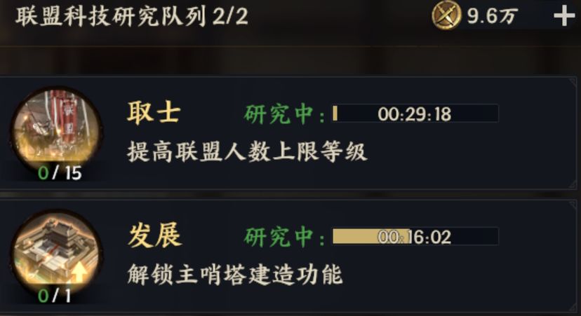 2.1.1 主哨塔首先想要建立分哨塔,得必须先有一个主哨塔,主哨塔是联盟领地的起始点,主哨塔只能通过修复1级县城附近的哨塔废墟建造。主哨塔建好之后就不能手动拆除了,一定要注意主哨塔落地的位置,尽量避免和其他联盟“撞塔“。而建立主哨塔的前提是联盟科技“发展”等级≥1,研究该科技花费30分钟,而且修复哨塔要花费2小时,所以官员创建联盟后,联盟功勋足够了要第一时间研究这个科技。