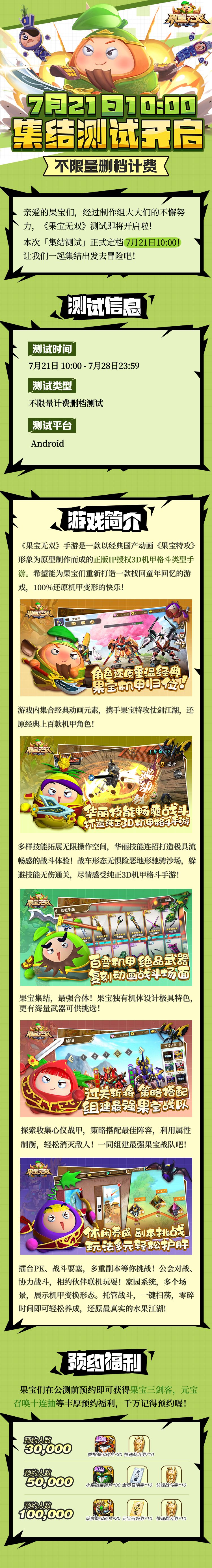 本次「集结测试」正式定档于7月21日10:00!果宝三剑客及水果江湖的各位已经在等待大家啦~