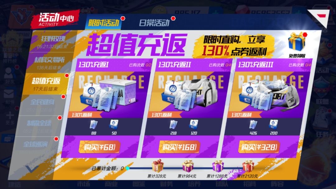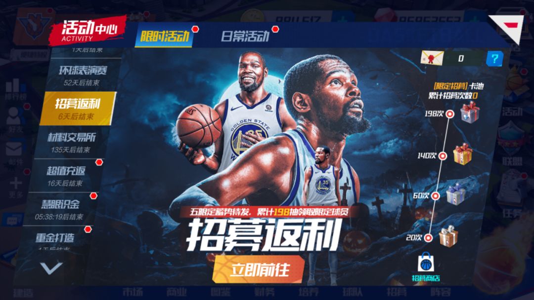 活动期间,将累计经理人在【限定招募】卡池中进行招募的招募次数,招募次数到达一定数量后即可领取进度奖励,奖励中包含巨星介绍信,可用于在招募商店中兑换限定球员。招募至198次,可领取勇士限定球员凯文·杜兰特。
