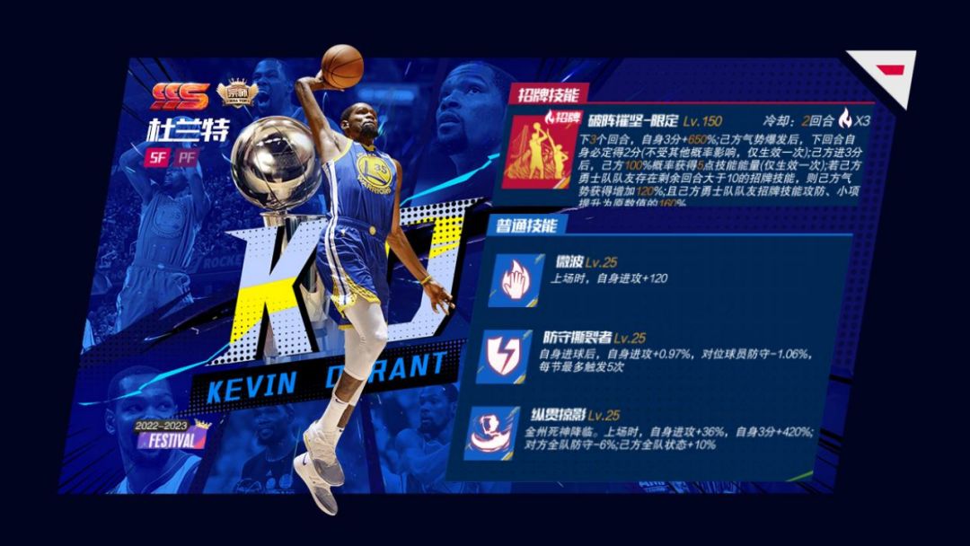 纵贯掠影:金州死神降临。上场时,自身进攻+X%,自身3分+Y%;对方全队防守-X%;己方全队状态+X%
