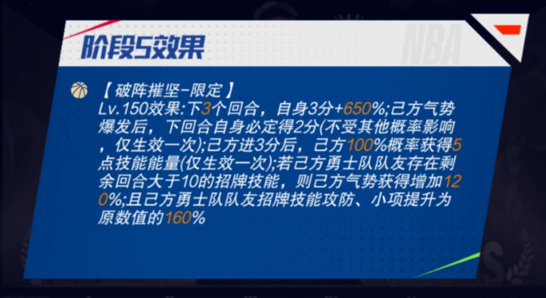 破阵摧坚:下X个回合,自身3分+X%;己方气势爆发后,下回合自身必定得2分(不受其他概率影响,仅生效一次);己方进3分后,己方X%概率获得Y点技能能量(仅生效一次);若己方勇士队队友存在剩余回合大于10的招牌技能,则己方气势获得增加X%;且己方勇士队队友招牌技能攻防、小项提升为原数值的X%(预计在上线同时开启迈向巅峰)。