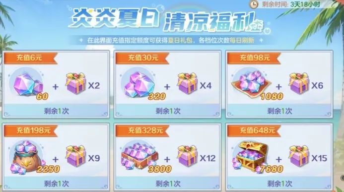 ✦在此界面充值指定额度,即可获得夏日礼包哦!各档位次数每日刷新~