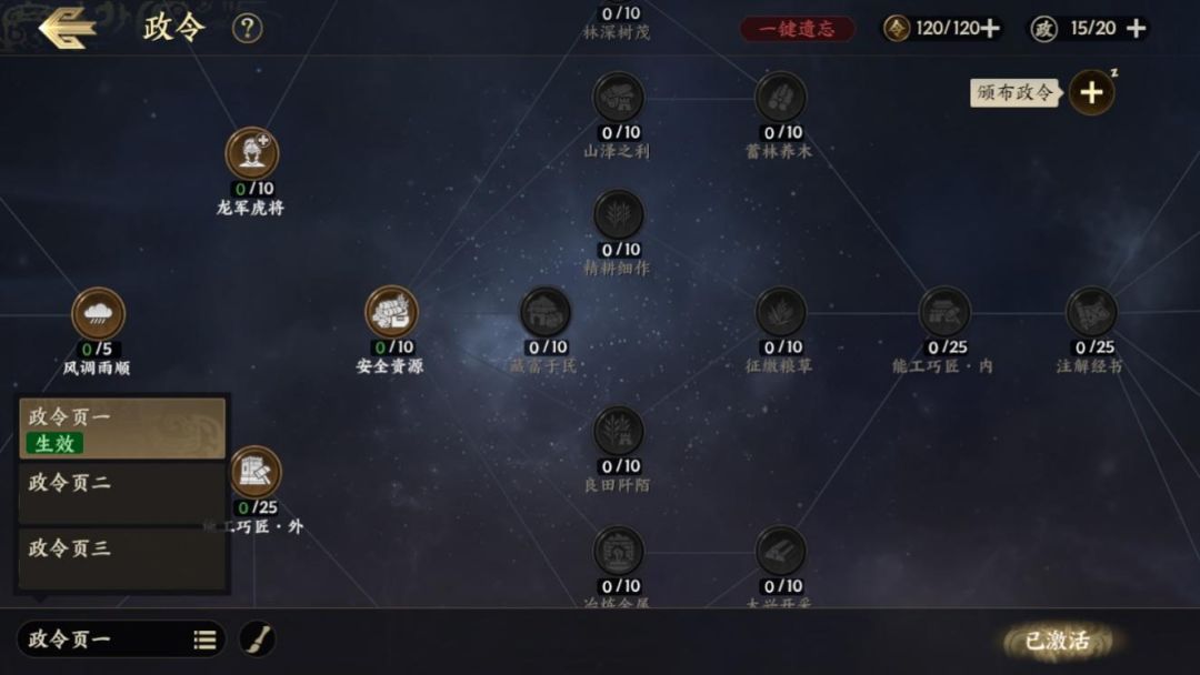 主公们要将政堂等级提升至5级后开启政令系统,换言之需要保证公府等级达到16级才能满足升级5级政堂条件。主公们可要注意不要拉下建筑等级的进度哦!小编给主公们介绍一下政令的基础设定。政令共分为主动政令和被动政令。两种政令的研修都需要消耗政令点,主动政令研修后需要消耗军令点进行生效。政令点只能通过提升政堂建筑等级获取;军令点会根据时间恢复,并设有120点军令的上限。主公们每天可以额外购买4次军令,每次消耗50银锭来恢复15点军令。除此之外,主动政令的生效时间存在限制,政令失效后进入冷却时间,等待冷却后主公才能再次颁布使其生效。而被动政令则为常规政令,研修后立即生效,无需颁布且不存在生效时间限制。主公们也可以根据自身战略发展所需,随时使用银锭来遗忘已经研修或者颁布新的政令。