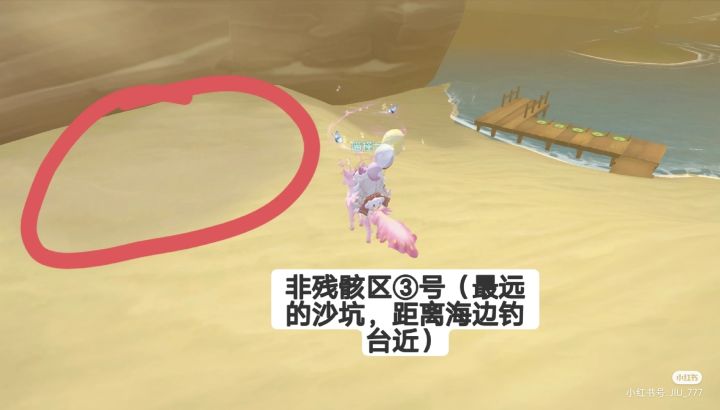 ❗目前非残骸坑的位置分别在沙漠传送门的左右两边的两个沙坑以及沙漠最里面临海钓台的沙坑,可以白天垂钓常驻传说鱼七彩水母!