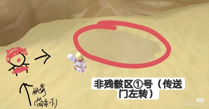❗其次我们要知道每个区每个服的沙漠每天只开放一个沙坑(可能是残骸坑,也可能是非残骸坑,需要摩摩去换服跑图找想要的沙坑)。开放的沙坑周围是沙子环绕的样子,不开放就如图所示是沙坑阴影,不能沙钓~