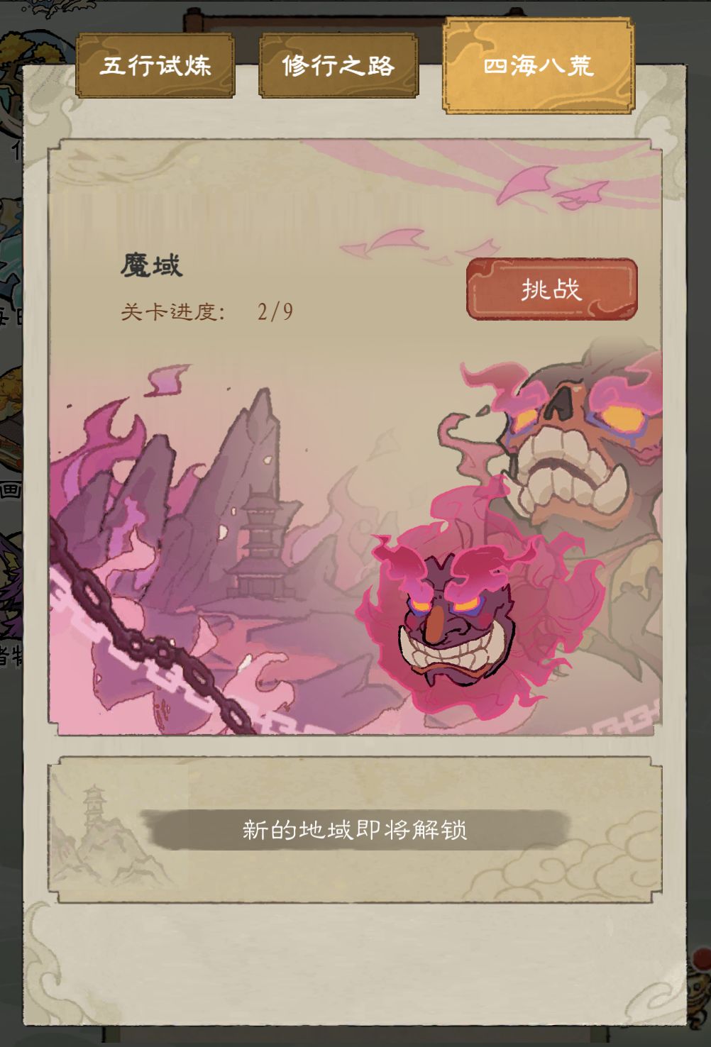 解锁后可在关卡类型选择界面切换为“四海八荒”后挑战魔域