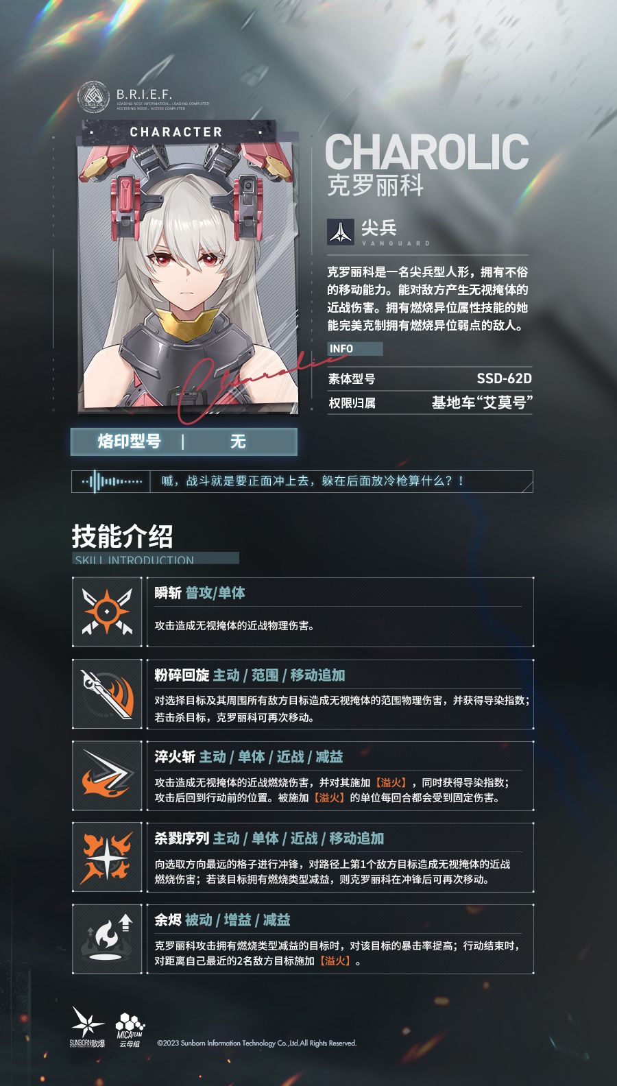 克罗丽科是一名尖兵型人形,拥有不俗的移动能力,不仅能对敌方造成无视掩体的近战伤害,拥有燃烧异位属性技能的她,还能完美克制拥有燃烧异位弱点的敌人。