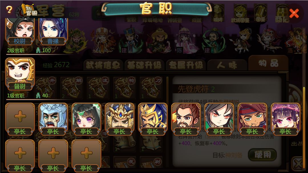当督尉再往高级晋升的时候就将出现文理科分班了,错了是文武分支,曹掾后期是往计谋、辅助类的路线,校尉则后期是攻击、机动、防御类的路线。