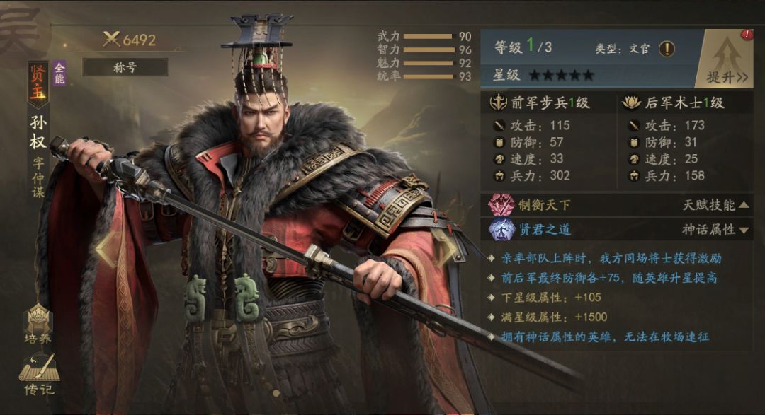 三国时期孙吴开国皇帝,吴国的缔造奠定者、六朝开拓者之首。孙权的基础天赋【制衡天下】,使龙吟作为主要输出技能。君王天赋【贤君之道】可增加前后军防御,并在上阵时激励我方其他将士。