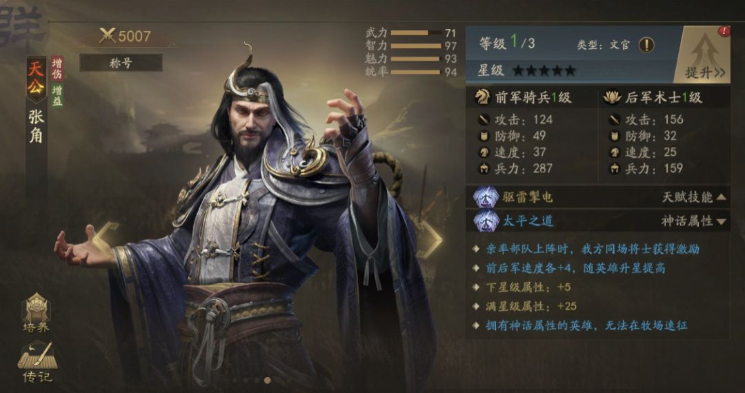 东汉末年太平道首领、农民起义军“黄巾军”的领袖。张角是主公们可通过完成活跃任务获得的神话英雄。天赋【驱雷掣电】可提高术士的伤害、防御和免伤,君王天赋【太平之道】更是可以加速前后军速度。