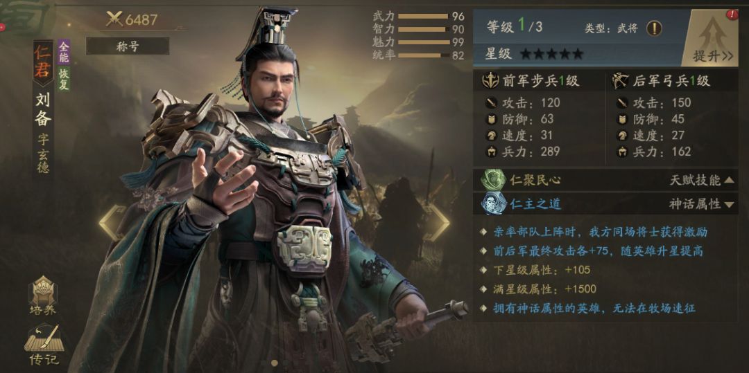 西汉中山靖王刘胜之子,是三国时代蜀汉政权的开创者暨第一位皇帝。基础天赋【仁聚民心】可以让刘备在每次对决中都通过发动【龙吟】,触发【仁德】恢复兵力,也使刘备不会被一些斩首将给斩落。