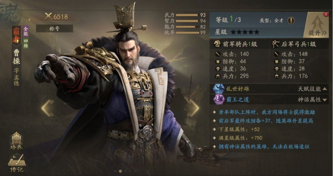 三国时期曹魏奠基人。曹操的基础天赋【乱世奸雄】,可以触发【枭雄】技能斩落敌方英雄。而觉醒天赋【霸王之道】,更可在曹操上阵时激励我方同场将士。