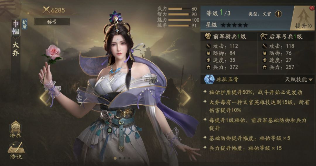 庐江桥公之女,小乔之姊,东汉末年江东孙策的夫人。大乔拥有优秀的魅力、智力和统率,在文官职业中的表现十分优秀。大乔的基础天赋【冰肌玉骨】,提升福佑护盾效率并在战前必定发动,使她面对无论是清理城防还是面对同战力英雄,都有非常大的优势。