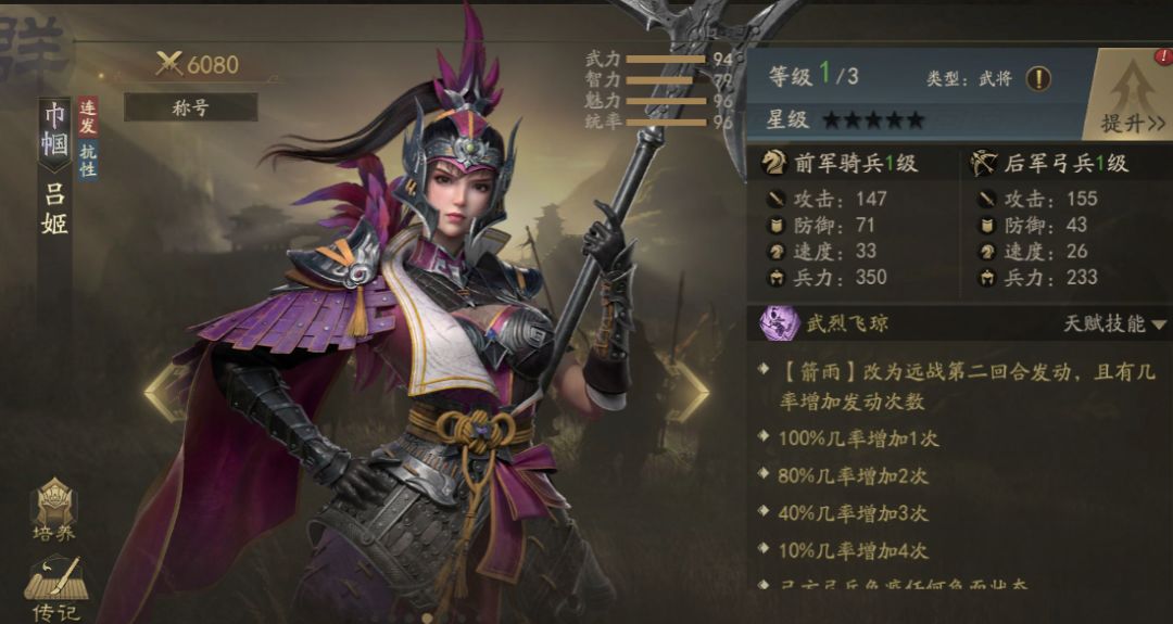 传说中吕布之女。吕姬的基础天赋【武烈飞琼】主打【箭雨】连发效果,同时弓兵可免疫所有负面状态,提高弓兵兵力与暴击率。
