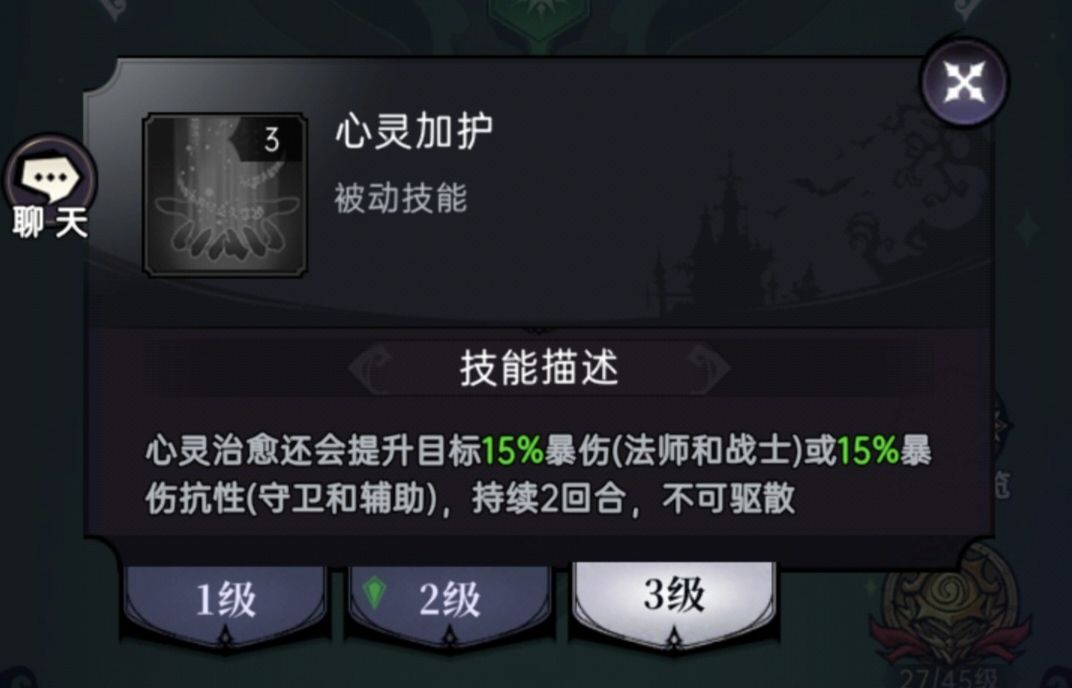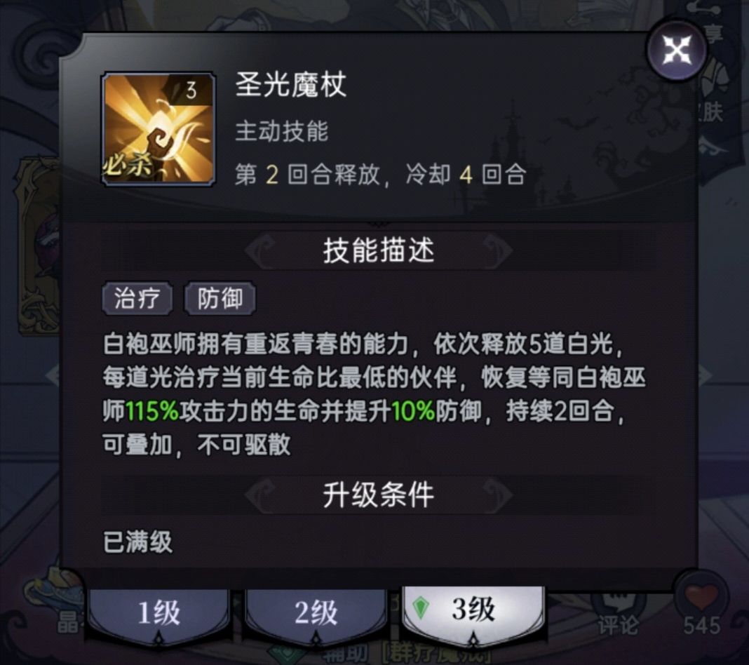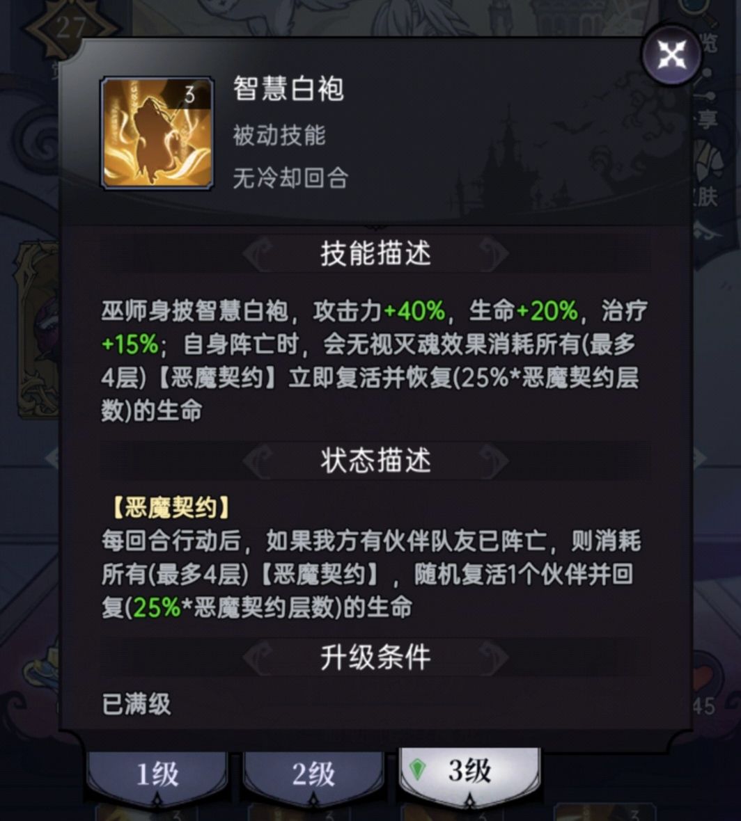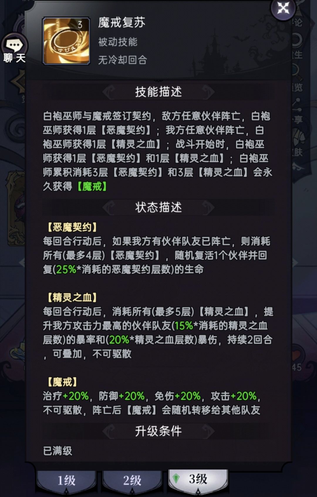 4技能被动,白袍巫师行动后叠加一层恶魔和精灵,敌方阵亡叠一层恶魔契约,我方阵亡获得一层精灵之血
