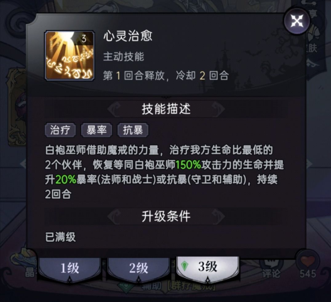 白袍的1,3技能都可以触发精灵秘术、明镜(并不叠加触发),泰坦C位2回合稳定减伤,很适合配合白袍的3技能,配合觉醒能够提供给C位攻击力和防御。