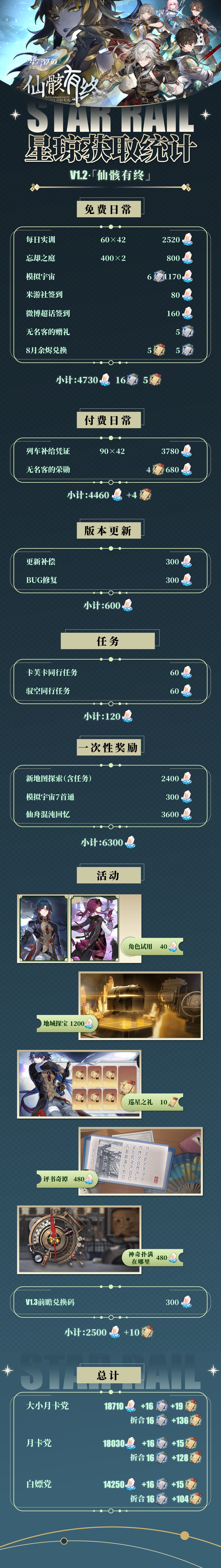 结合已知信息与版本内容,本篇攻略将尽可能详尽与准确地计算出1.2版本(以具体更新日期2023.7.19为起点,至2023.8.29共42天时间)可获得的星琼数量,方便大家更好地对接下来的角色和光锥抽取进行充分规划。