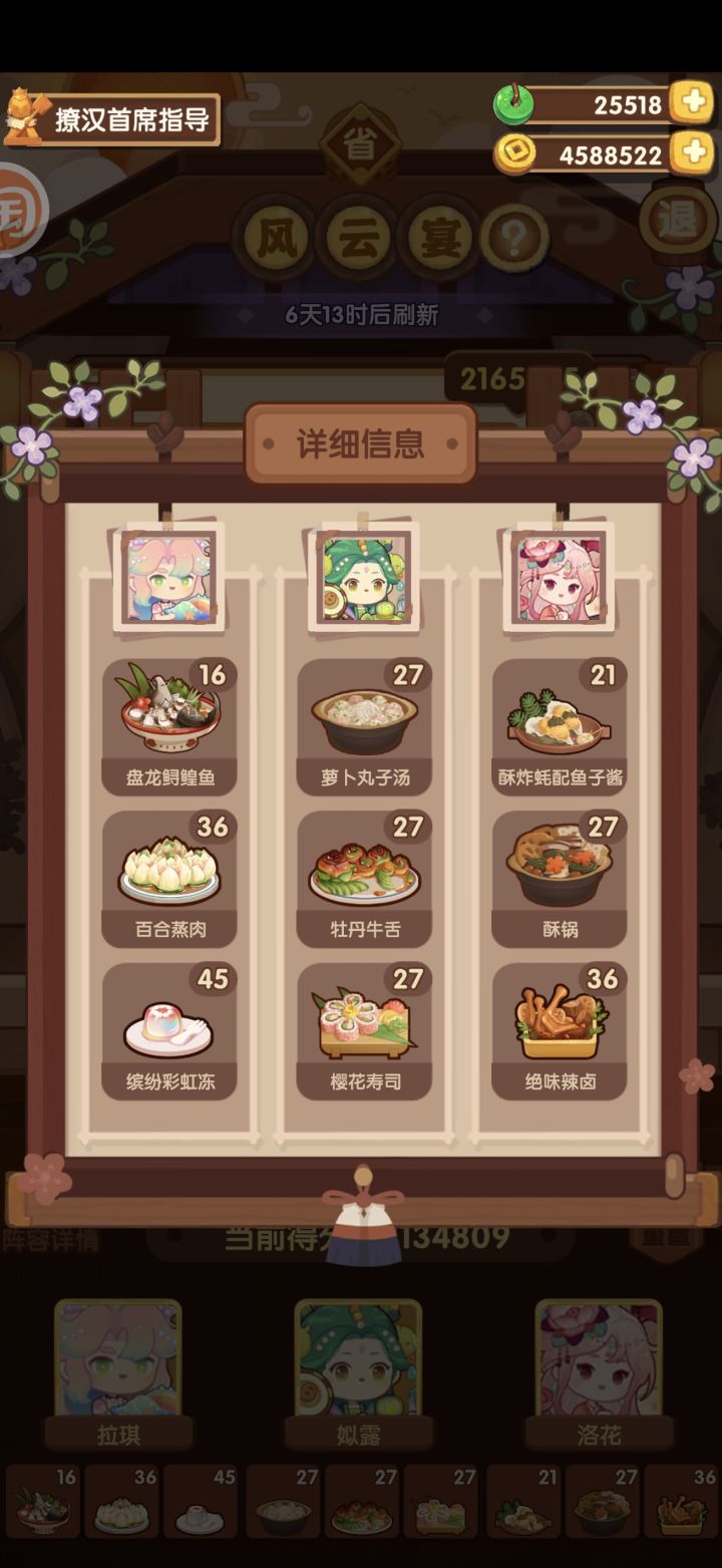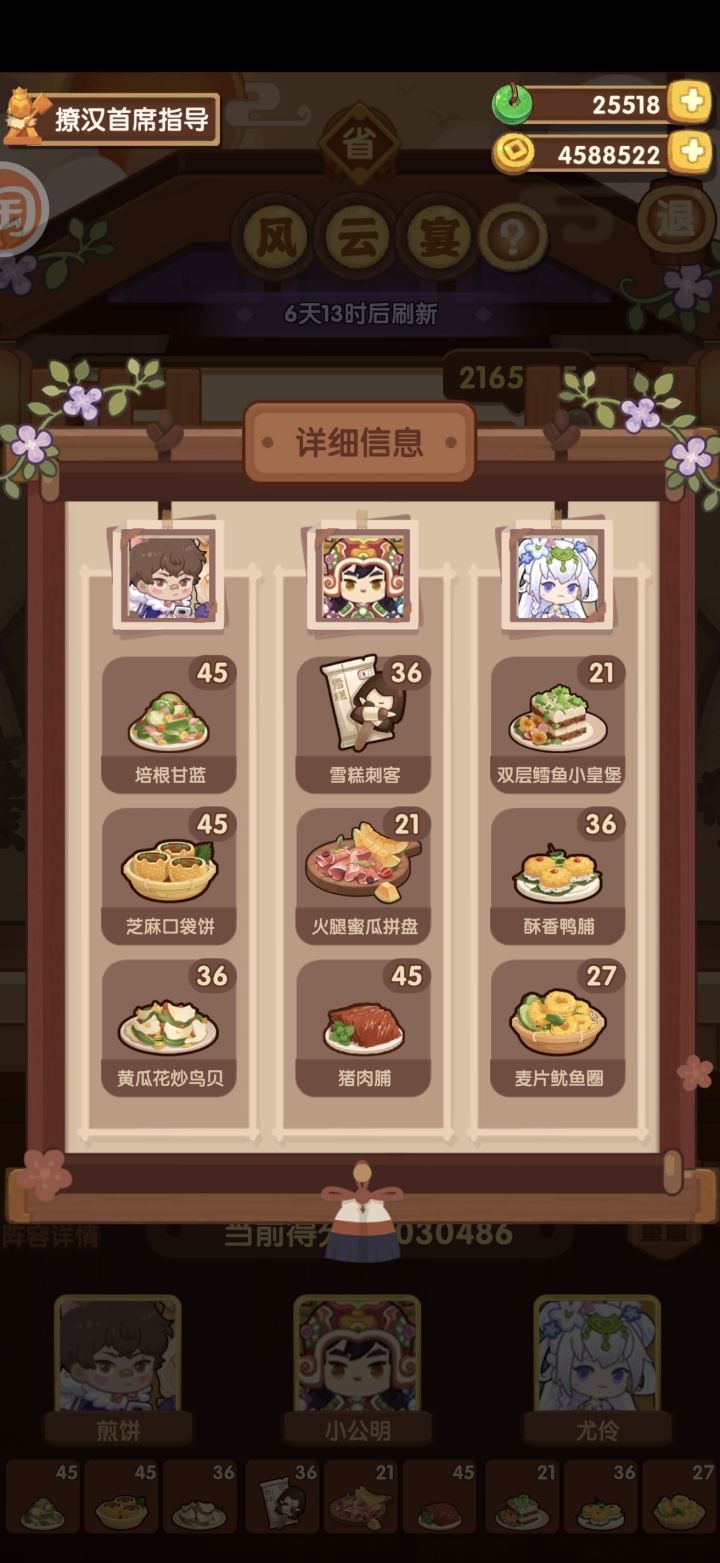 无生蚝、仙丹、年夜饭、24桥等菜谱。小公明装备了三星躺平鸭杯,尤伶是三星金斩骨刀,其余都是1星的售价厨具。尤伶和小公明也有更好的1星售价可以选择但是我不想碎。另外我好几个菜谱也没有专精,所以还有进一步提升空间,萌新十分友好。