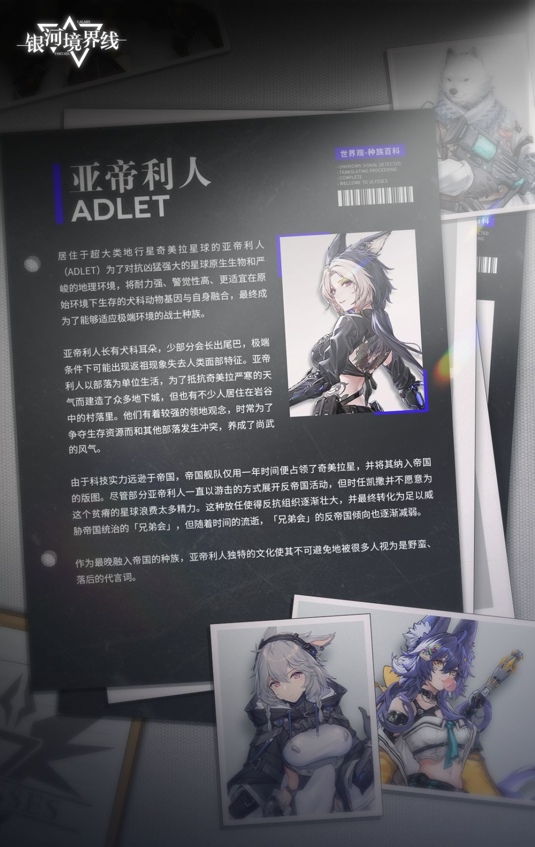他们为了对抗凶猛强大的星球原生生物和严峻的地理环境,将耐力强、警觉性高、更适宜在原始环境下生存的犬科动物基因与自身融合,最终成为了能够适应极端环境的战士种族。
