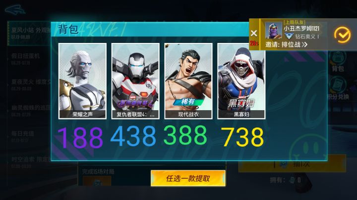 枯了 第四抽的史诗皮肤是模仿大师的黑寡妇 看起来好丑 竟然是738星际币的 所以我应该换哪个啊