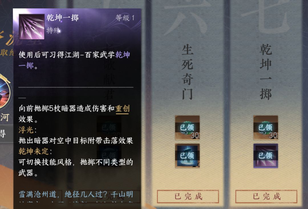 接着来杭州(674.1098)坐船去镜湖找寒山书生,解开棋局后(答案是“雁”)打开旁边的宝箱可以获得“乾坤一掷-羽”上卷,下卷需要来到杭州(1150.1150)这里领悟棋局后获得。