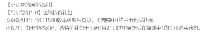 周年番外道具,游戏里现在卖13600一个,解锁需要十个。今天零点就解锁番外,结果现在才告诉有周年福利礼包,而且还只在q群里发了公告,游戏里都没发。那我们这种今天零点就买道具开番外的,就白花这么多约兰币吗?合着我们积极参加活动还有错了吗?群里出现这个问题的姐妹不在少数,没有那么多要求,把这部分钱给我们退回来不过分吧,毕竟十个道具13w呢,每天看广告才给几千约兰币。