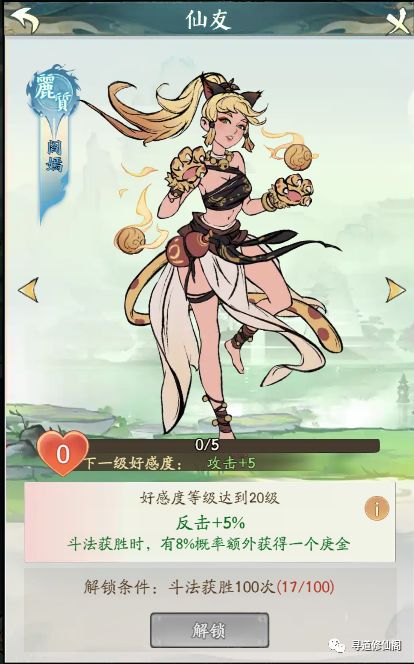 斗法获胜100次解锁阎嫣,增加角色反击率,斗法获胜时,有概率获得庚石;好感度加成:斗法获胜有概率获得庚石;建议:不玩反击流的玩家不建议升级阎嫣,性价比不高;