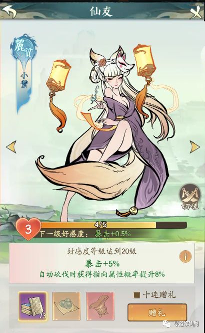 解锁仙友模式,即初始解锁小紫,增加好感度,自动砍伐时获得指向属性概率提升;好感度加成:自动砍伐时获得指向属性概率提升;建议:小紫仙友对于指定装备获取有很大的帮助,在后期仙树升级到一定等级后,咱们就要开始确定流派,需要获得指定装备,因此小紫可以变向帮助玩家节约桃子获得想要的装备。暴击流推荐主要升级小紫好感度,满级可以获得暴击+40%;