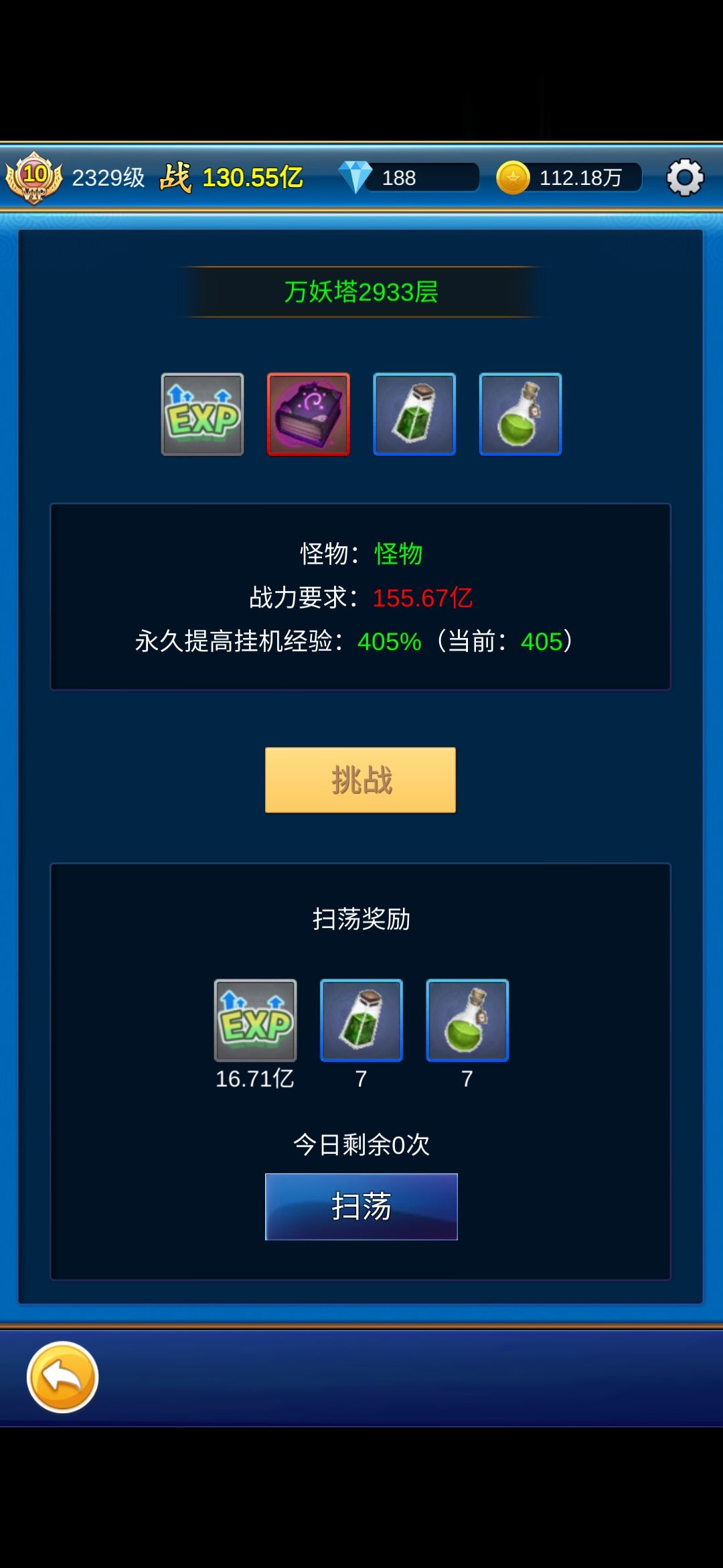 第四,万妖塔和符文塔每天可以免费扫荡1次,看广告显示增加3次扫荡,实际增加5次扫荡