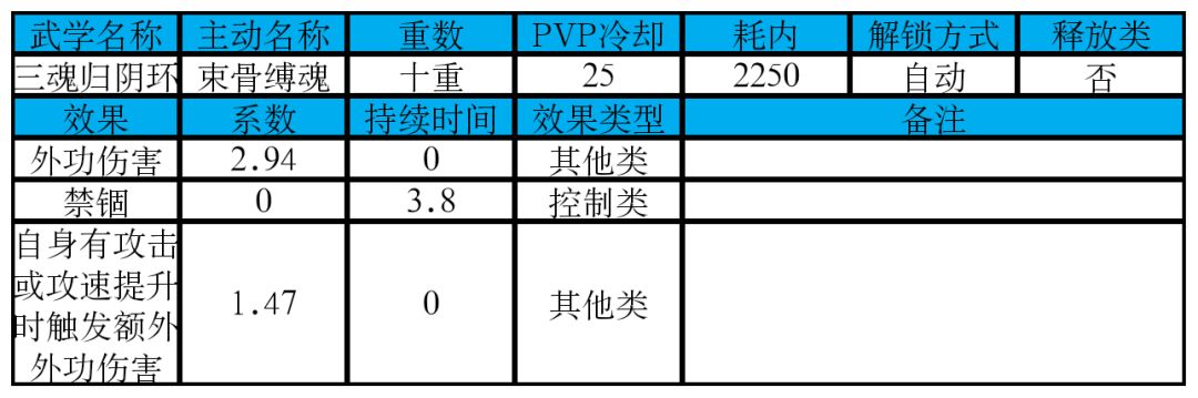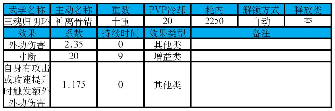 主动技能神离骨错,外功伤害约为3391,额外外功伤害约为1695,总伤害约为5086。新机制寸断,效果是:buff持续时间内,每隔1次平A命中时,扣除对手一定体力值,十重每次扣除20。注意招架、闪避不算命中,不计算次数。寸断属于增益类效果,可以被截脉、窃取。通常情况下9秒内三魂归阴环可以平A 17-18次,命中15-16次,触发7-8次扣除体力,共扣除对手140-160体力值。大致可以等效为18%左右的减速debuff,或者0.65秒左右的控制。效果本身并不强,属于锦上添花,还是以伤害为主。自身有加速buff时可以提高扣除体力次数,同样,也会受对方的减速debuff、招架闪避、控制等影响。扣除体力效果不会被偏转、护盾等防御手段抵挡。