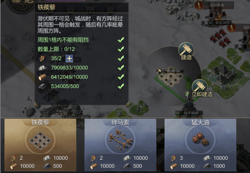 每日可用元宝购买15枚军令,随着主君等级提升军令数量上限也可提升,总上限为35枚。军令多用于建造野外建筑、路障机关作为消耗道具使用。在主君们互相战斗时,野外建筑和路障机关会在作战时起到极大作用,所以主君们可要好好使用手上的军令哦。
