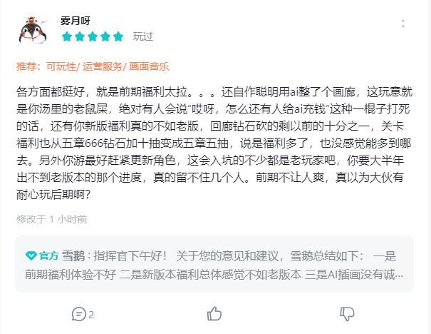 再比如小分队的老朋友~雾月大大,在体验过小分队后对游戏福利提出了质疑;