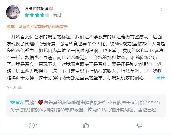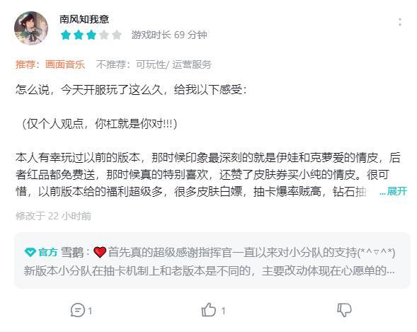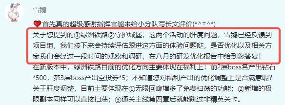 比如一直关注小分队的回坑玩家~旋律大大,在游戏肝度体验上提出了评价和建议;